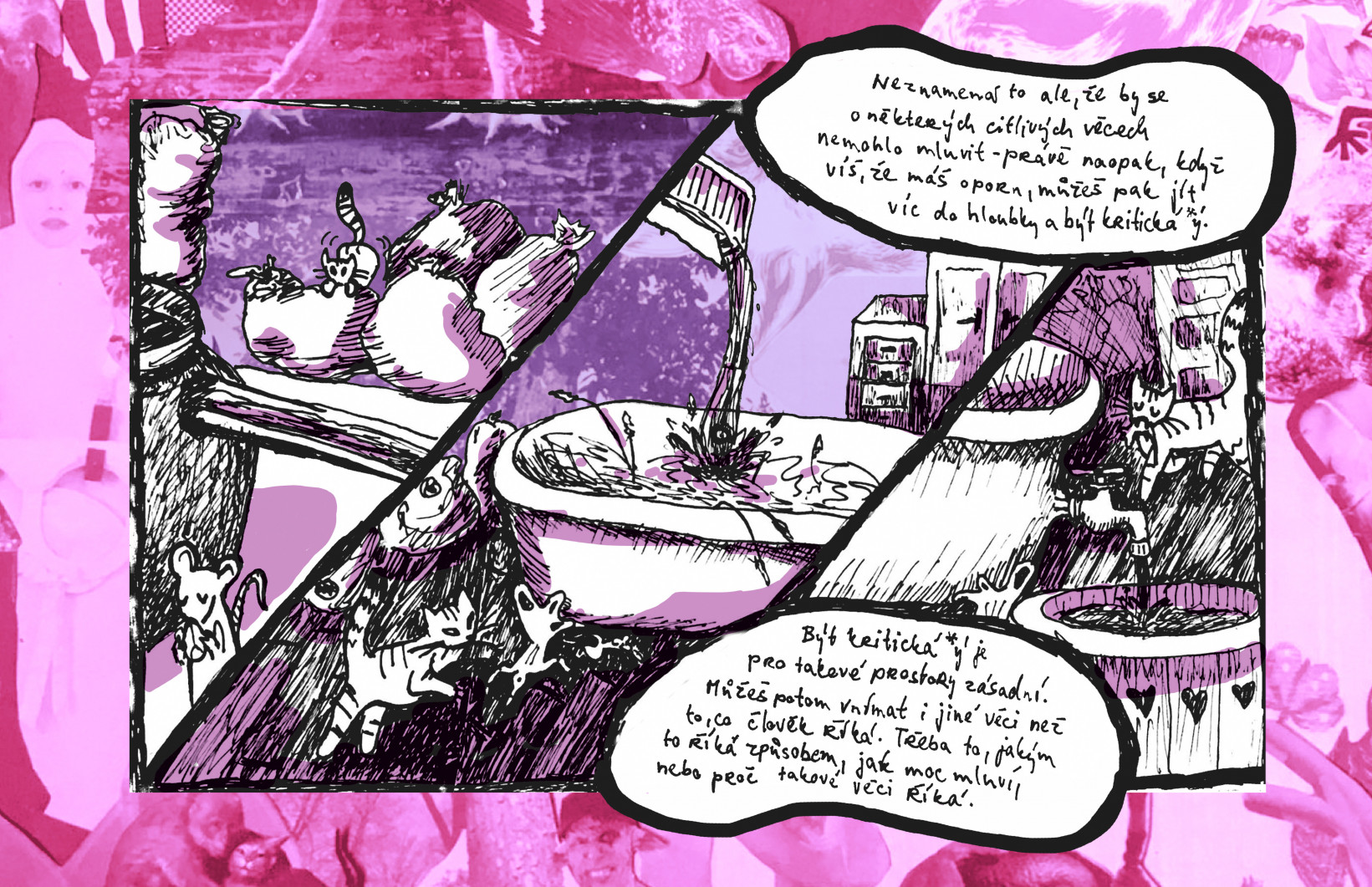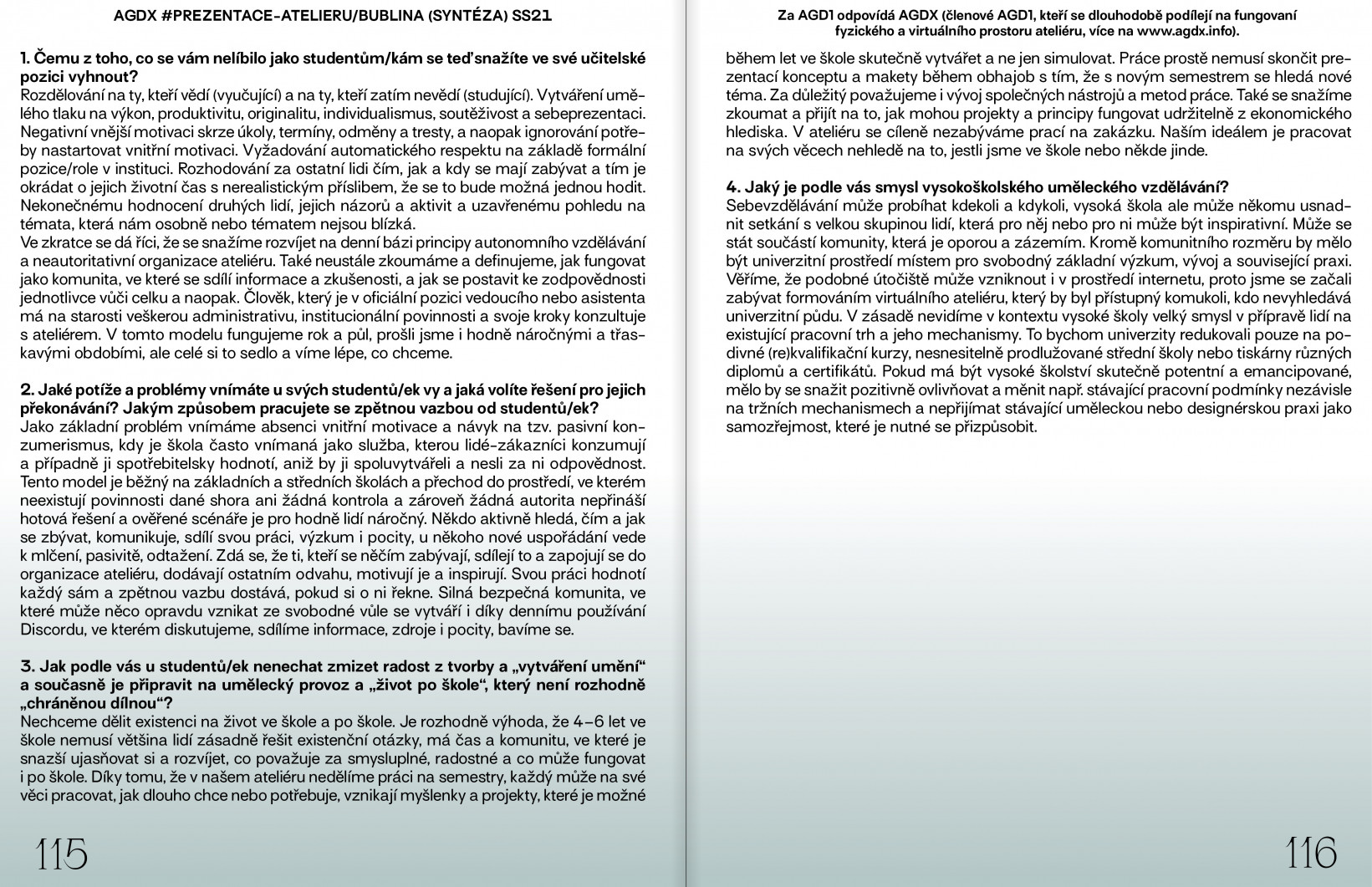 K realizaci těchto proměn je podle nás nezbytný náš vlastní přístup: odvaha mluvit o věcech, o kterých se mluví těžko, podpora těch, kteří jsou na pochybách ohledně hranic nastavených v prostorách ateliérů a péče o ty, kteří jsou si jistí/jisté, že jejich hranice byly překročeny již dávno. Možná se tímto otevírá prostor pro společné odražení se ode dna, pro vyjádření potřeb, které byly dosud nevyslyšeny, přehlíženy nebo zamlčeny a pro přenastavení zaběhlých zvyklostí, včetně skutečného narušení hierarchické struktury. Ne ve smyslu zbavování se zodpovědností, ale přesně naopak, v její sdílení.