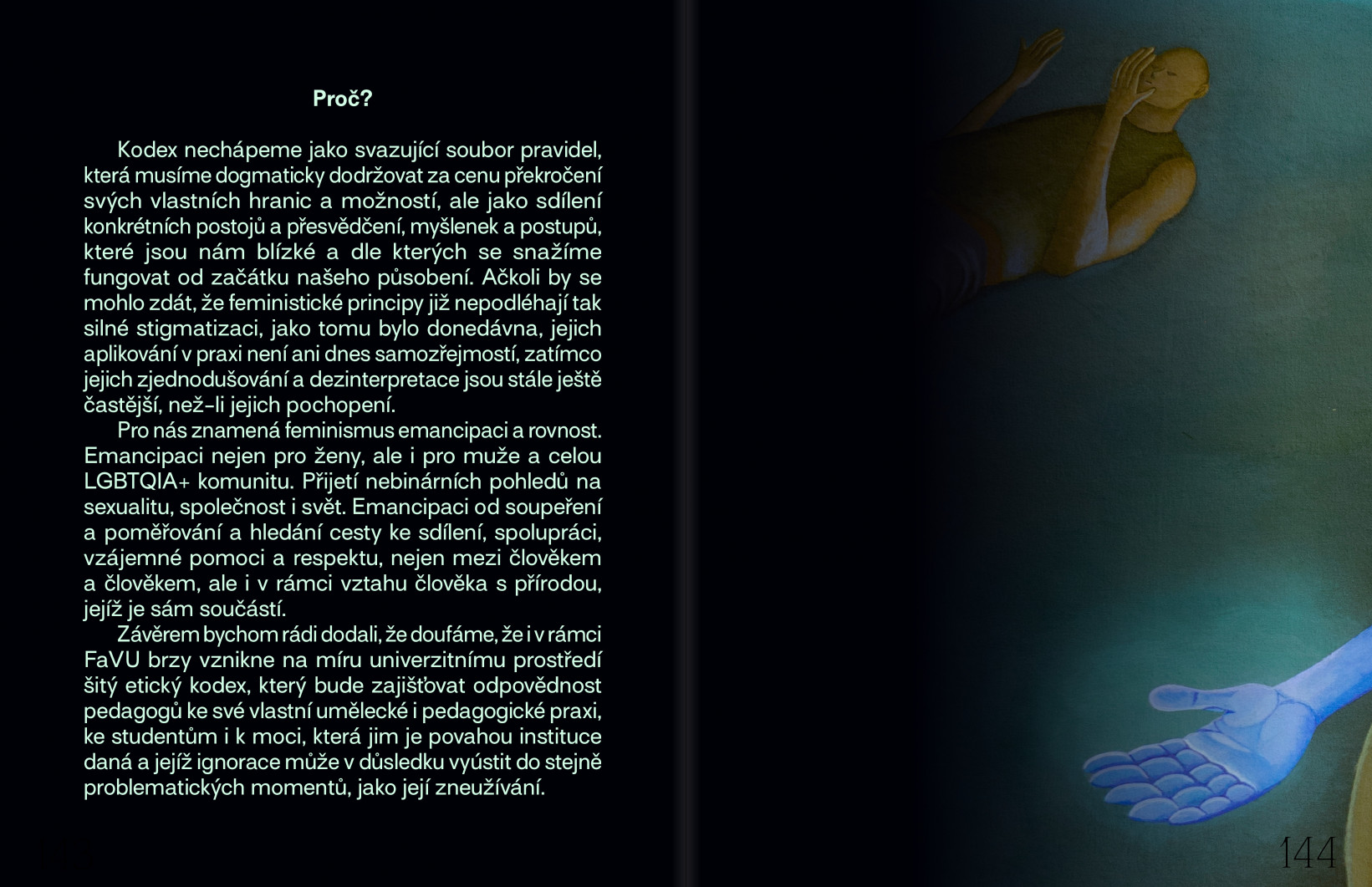 Závěrem bychom rádi dodali, že doufáme, že i v rámci FaVU brzy vznikne na míru univerzitnímu prostředí šitý etický kodex, který bude zajišťovat odpovědnost pedagogů ke své vlastní umělecké i pedagogické praxi, ke studentům i k moci, která jim je povahou instituce daná a jejíž ignorace může v důsledku vyústit do stejně problematických momentů, jako její zneužívání.