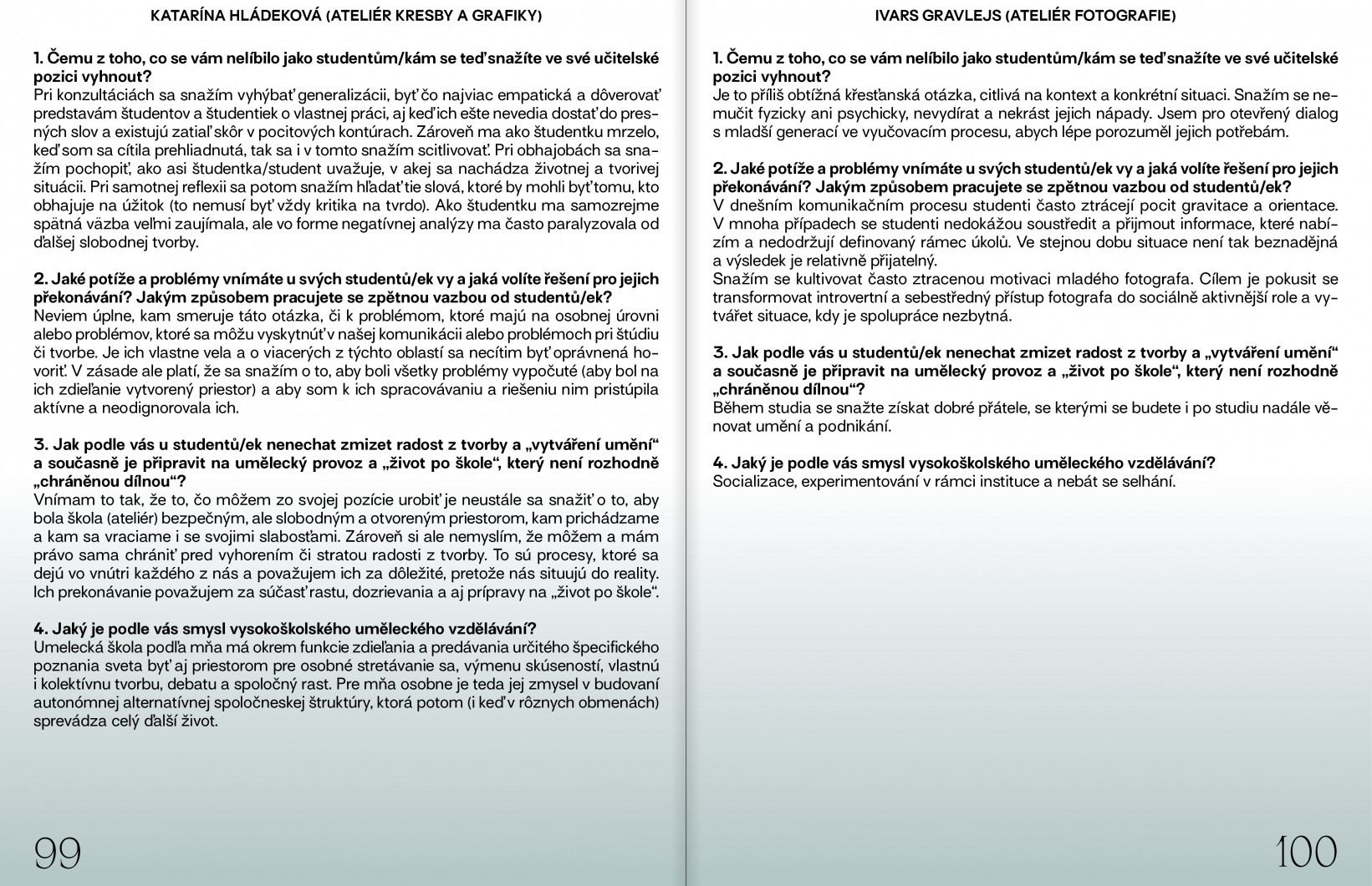 Vztahy mezi vedoucími ateliérů a studenty/studentkami jsou v mnoha ohledech velmi blízké a tím pádem i křehké. Proto považujeme za důležité, aby si pedagogové a pedagožky byli vědomi své pozice, která je vůči jejich studentům/studentkám z povahy vzdělávací instituce vždy nadřízená. K utvoření bezpečného prostředí v rámci těchto hierarchizovaných vztahů vnímáme jako primární nástroj vzájemnou nenásilnou komunikaci. Takovou, ve které se ti slabší nebo méně zkušenější nebojí mluvit, protože vědí, že budou vyslyšeni.