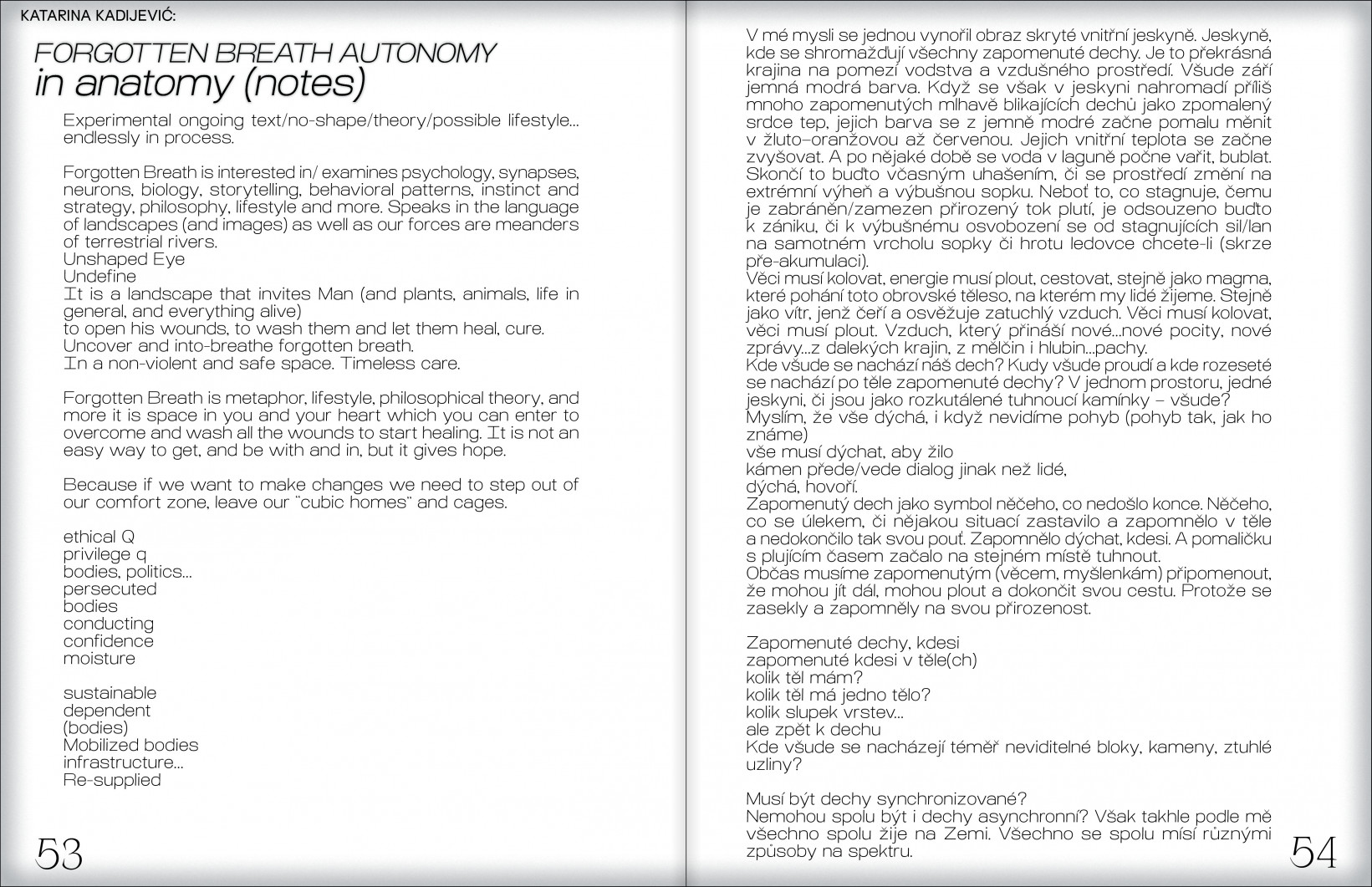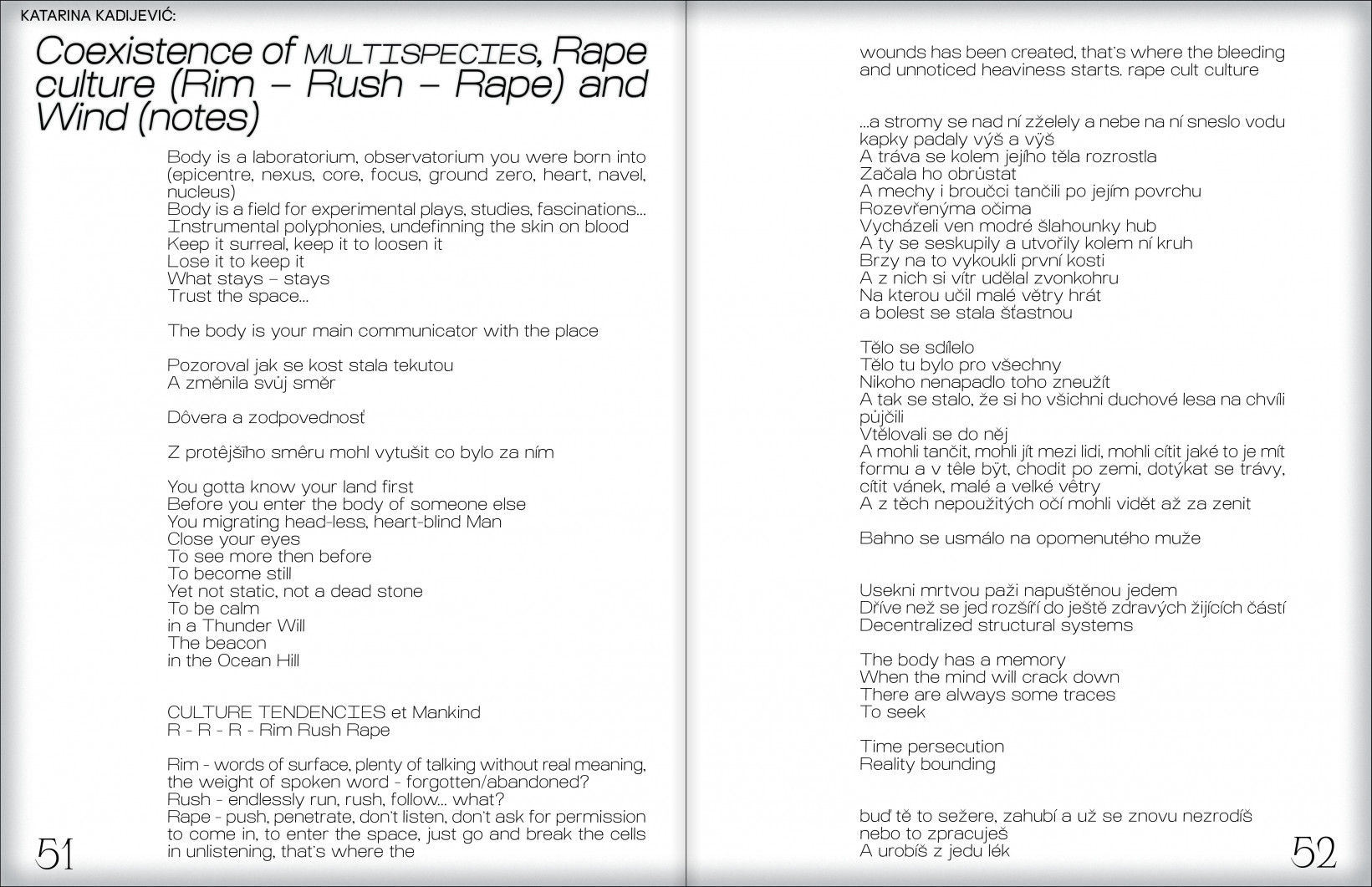 Katarina Kadijević nyní studuje v ateliéru Environmentu na brněnské FaVU. Ve své práci tematizuje mezidruhovou propletenost a její komunikační možnosti skrze fluidní dialog performance, textu, videa či zvuku.