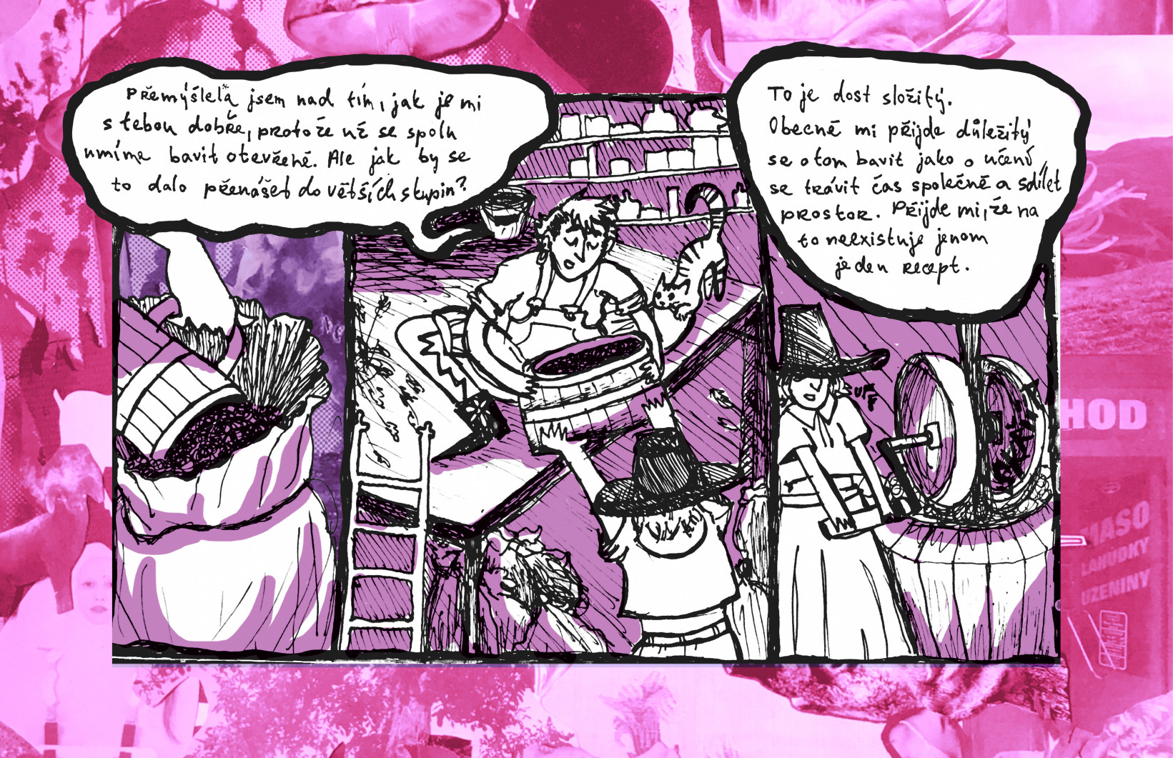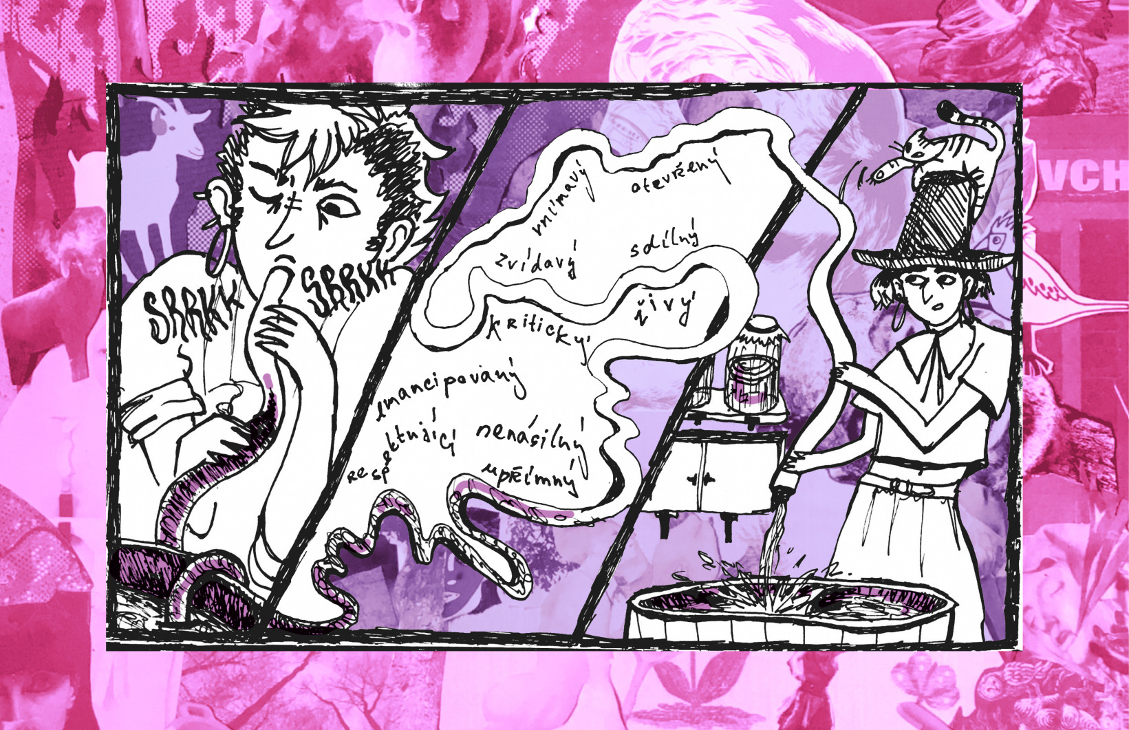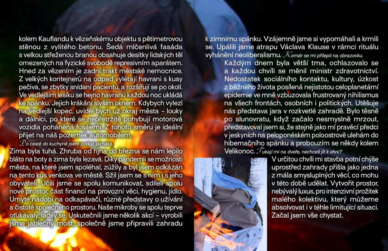 Zima byla tuhá. Zhruba od října do března se nám lepilo bláto na boty a zima byla lezavá. Díky pandemii se možnosti města, na které jsem spoléhal, zúžily a byl jsem odkázán na tento kus venkova ve městě. Sžil jsem se s ním i s jeho obyvateli. Učili jsme se spolu komunikovat, sdíleli spolu nově prostor, část financí na provozní věci, hygienu, jídlo. Umyté nádobí na odkapávači, různé představy o užívání a čistotě společného prostoru. Naše mikroby se spolu teprve oťukávaly, ladily se. Uskutečnili jsme několik akcí – vyrobili jsme jablečný mošt, společně jsme připravili zahradu k zimnímu spánku. Vzájemně jsme si vypomáhali a krmili se. Upálili jsme atrapu Václava Klause v rámci rituálu vyhánění neoliberalismu. Komár se mi přilepil na obrazovku.