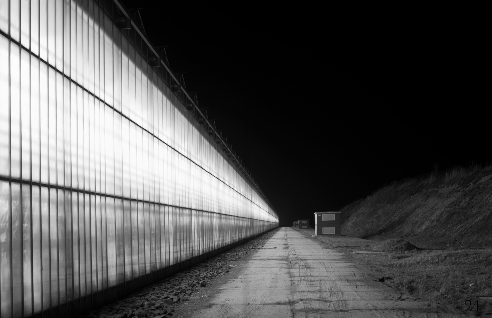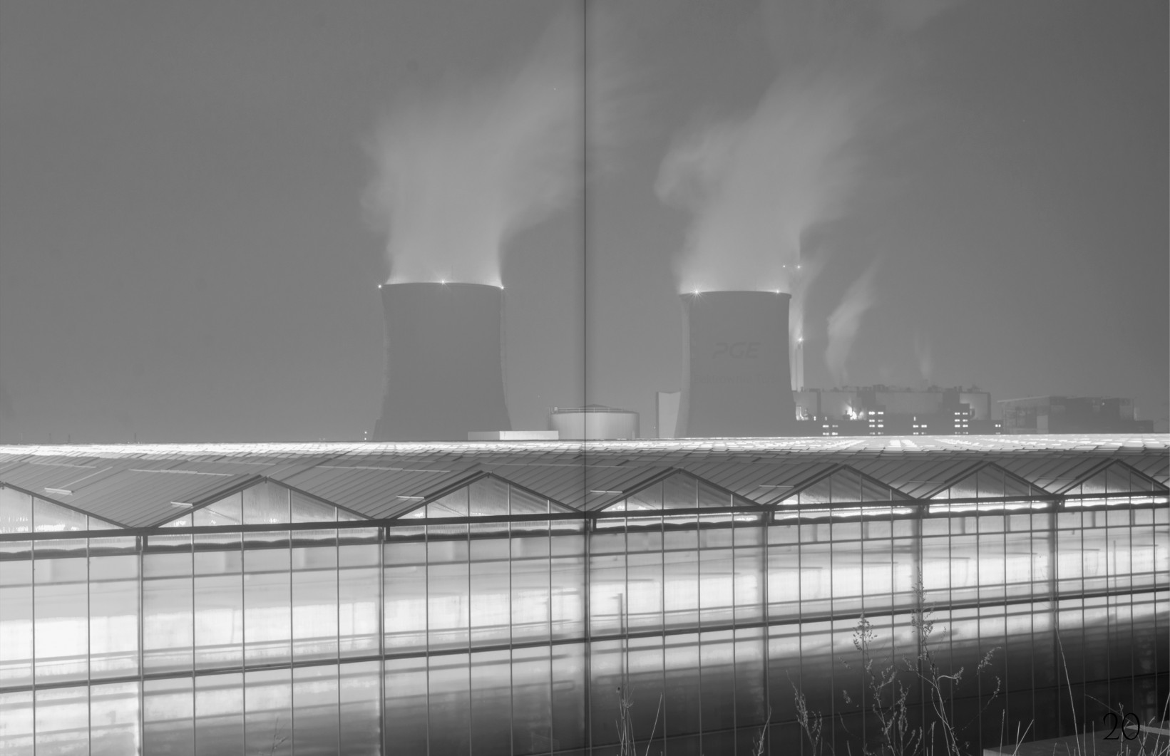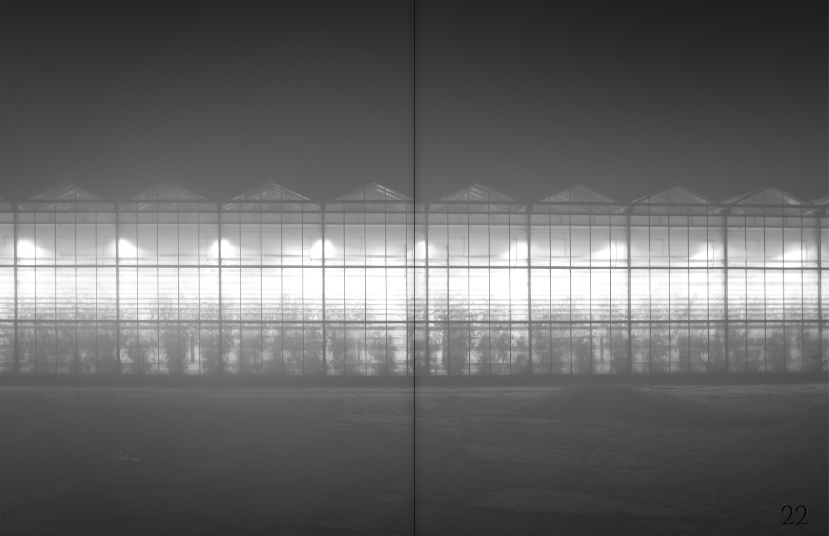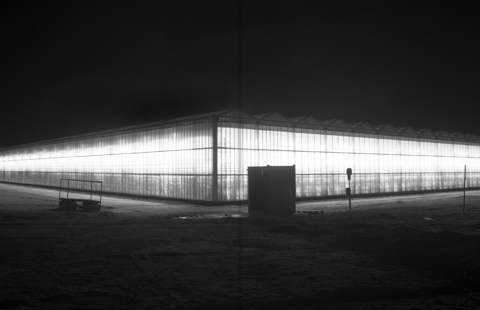 Už se úplně setmělo. Stojím kus od skleníku, pozoruji, jak jeho silná oranžová záře osvětluje celou krajinu v okolí a vytváří tak zvláštní podívanou – hybridní podmínky mezi denním jasem a noční tmou. Pořizuji fotografie ze všech možných úhlů s nadějí, že zůstanu nezpozorován ostrahou objektu. Když už jsem téměř na odchodu, proti mně se z ničeho nic vyřítí auto, ze kterého vystoupí postarší pán a dává mi najevo, že zde rozhodně nejsem vítán a fotografování je zakázáno. Pobízí mě, ať si nastoupím do auta, zajíždíme dovnitř komplexu a po chvíli přichází další dva kolegové z ostrahy, kteří po mě chtějí, abych všechny snímky smazal. Ukazuji jim pouze fotoaparát na film a po chvíli lámané domluvy mě naštěstí nechávají odejít.