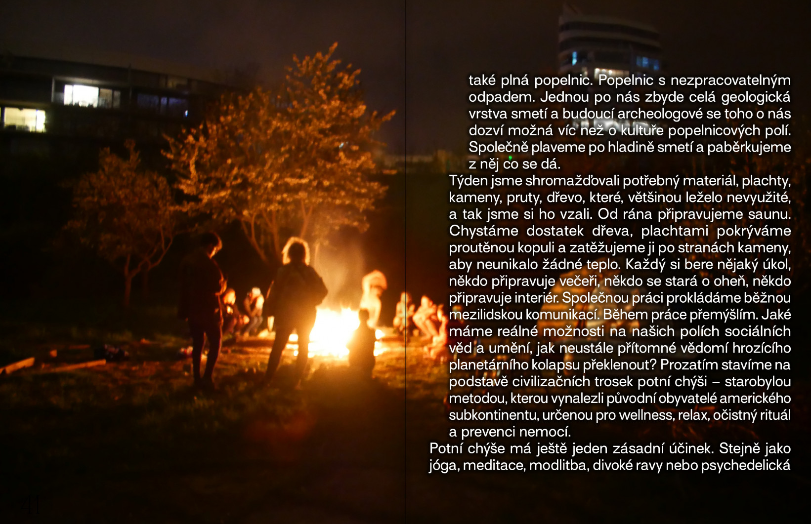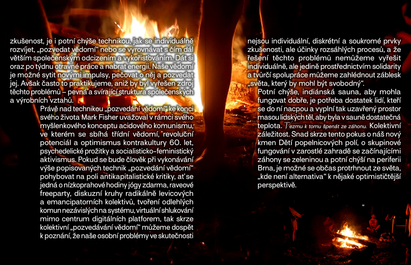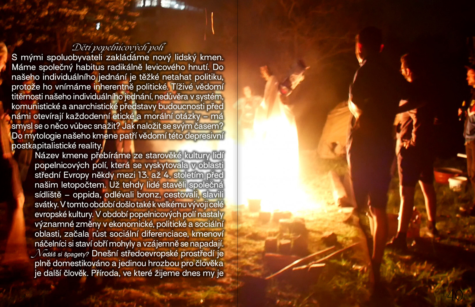 S mými spoluobyvateli zakládáme nový lidský kmen. Máme společný habitus radikálně levicového hnutí. Do našeho individuálního jednání je těžké netahat politiku, protože ho vnímáme inherentně politické. Tíživé vědomí titěrnosti našeho individuálního jednání, nedůvěra v systém, komunistické a anarchistické představy budoucnosti před námi otevírají každodenní etické a morální otázky – má smysl se o něco vůbec snažit? Jak naložit se svým časem? Do mytologie našeho kmene patří vědomí této depresivní postkapitalistické reality.