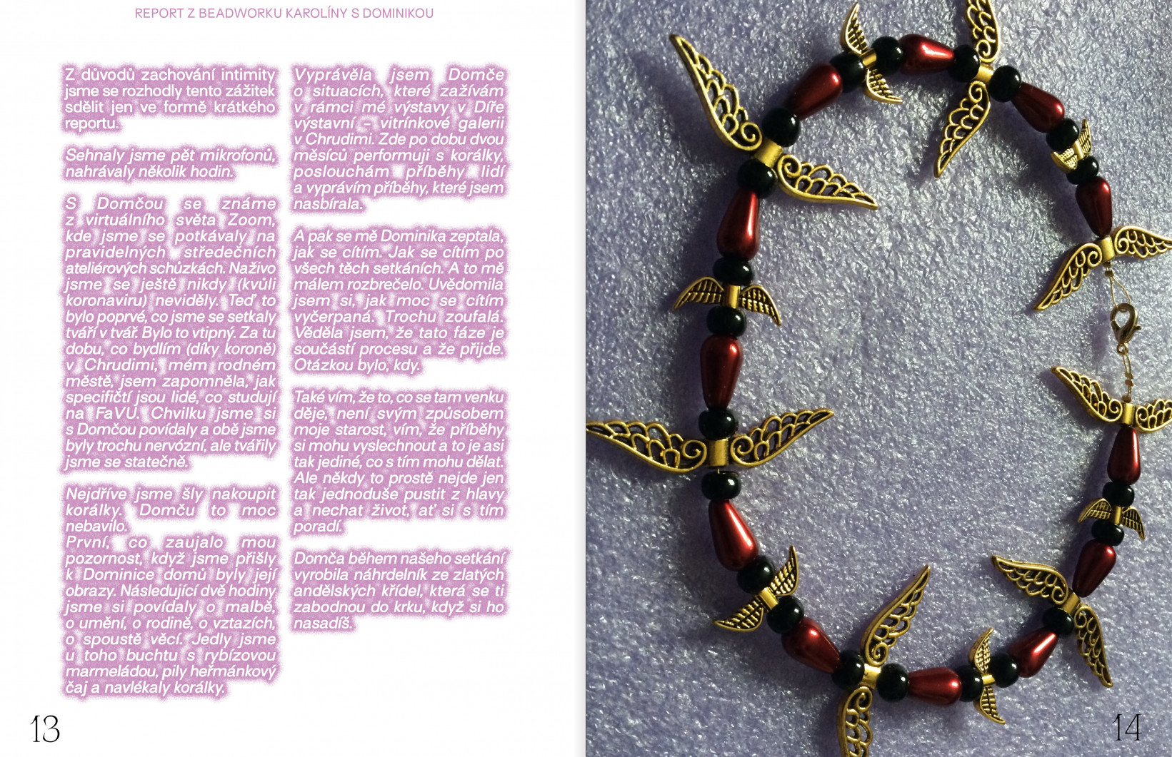 První, co zaujalo mou pozornost, když jsme přišly k Dominice domů byly její obrazy. Následující dvě hodiny jsme si povídaly o malbě, o umění, o rodině, o vztazích, o spoustě věcí. Jedly jsme u toho buchtu s rybízovou marmeládou, pily heřmánkový čaj a navlékaly korálky.