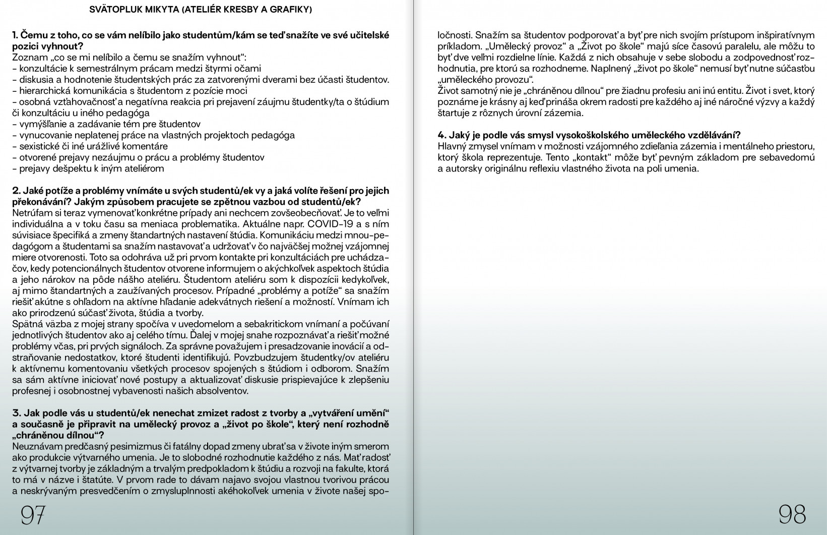 Během mého studia mi nejvíce vadilo, když do výuky příliš prosakovalo ego vedoucího ateliéru. Zažil jsem to nejprve jako student v Ateliéru intermédií u Václava Stratila a pak jsem se s tím setkal v menší míře i u Martina Zeta v Ateliéru video, kde jsem působil jako asistent. V Ateliéru intermédií se například jednou stalo, že přišel nejmenovaný sběratel se záměrem nakoupit díla studentů, ale nakonec si pořídil obrazy od vedoucího a studenti se o zájmu o koupi jejich děl ani nedozvěděli...