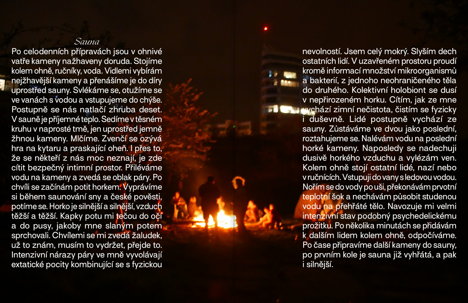 Každým dnem byla větší tma, ochlazovalo se a každou chvíli se měnil ministr zdravotnictví. Nedostatek sociálního kontaktu, kultury, úzkost z běžného života posílená nejistotou celoplanetární epidemie ve mně vzbuzovala frustrovaný nihilismus na všech frontách, osobních i politických. Utěšuje nás představa jara v rozkvetlé zahradě. Bylo těsně po slunovratu, když začalo nesmyslně mrzout, představoval jsem si, že stejně jako mí pravěcí předci v jeskyních na peloponéském poloostrově ulehám do hibernačního spánku a probouzím se někdy kolem Velikonoc. Ťukají mi na dveře, nechceš jít k ohni?