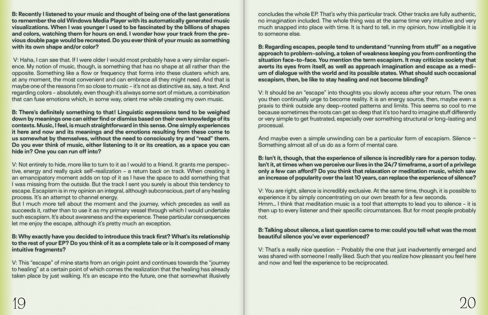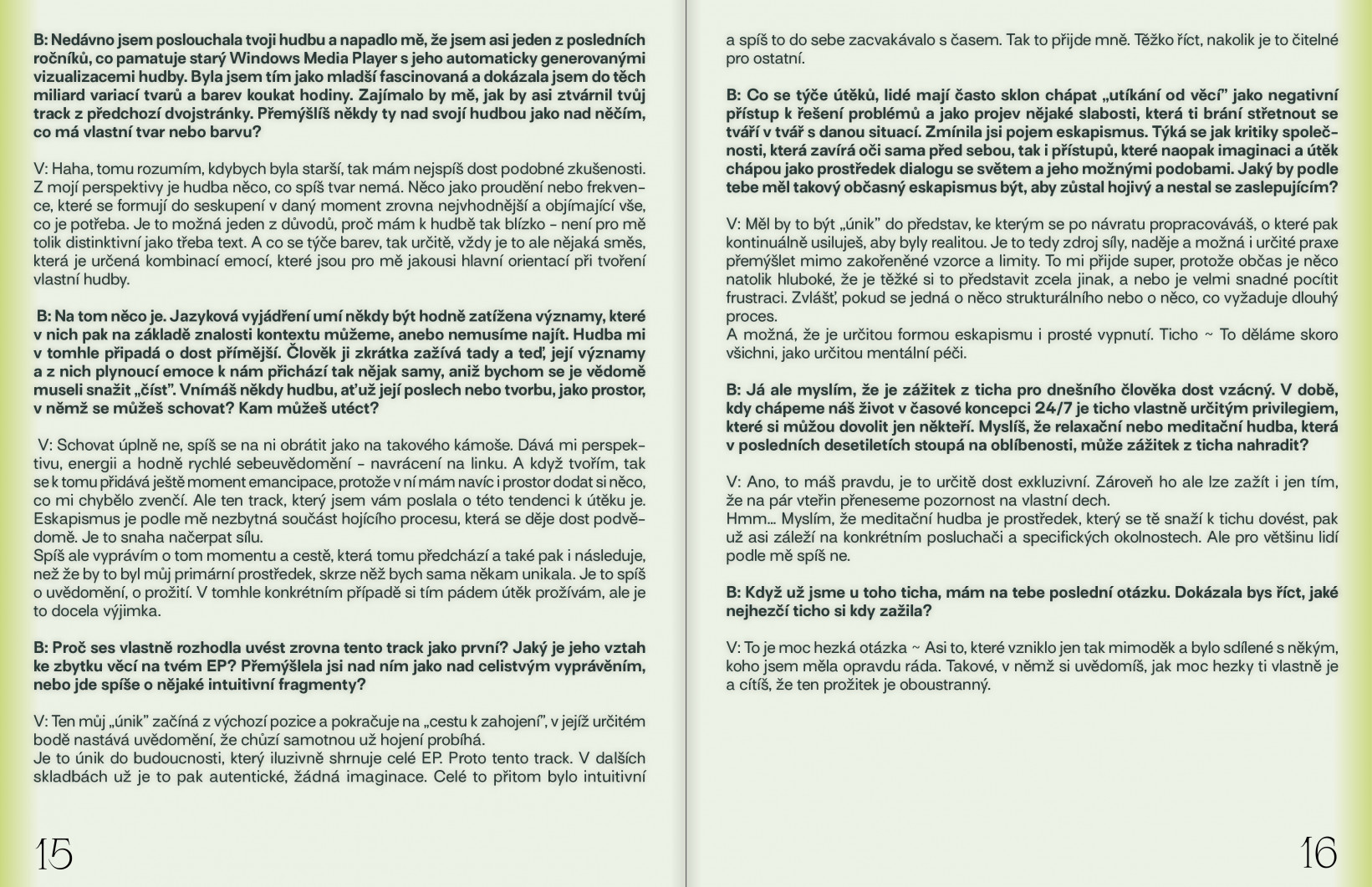 Vendula Heřmanská (*2001) studuje na FaVU v Ateliéru intermédií a v současnosti je na zahraniční stáži v Bukurešti. Pohybuje se převážně v oblasti zvuku, textilu a malby, ale proplouvá i skrze jiná média. Aktuálně se věnuje primárně fieldrecordingu a jeho potenciálu jako nástroje porozumění.