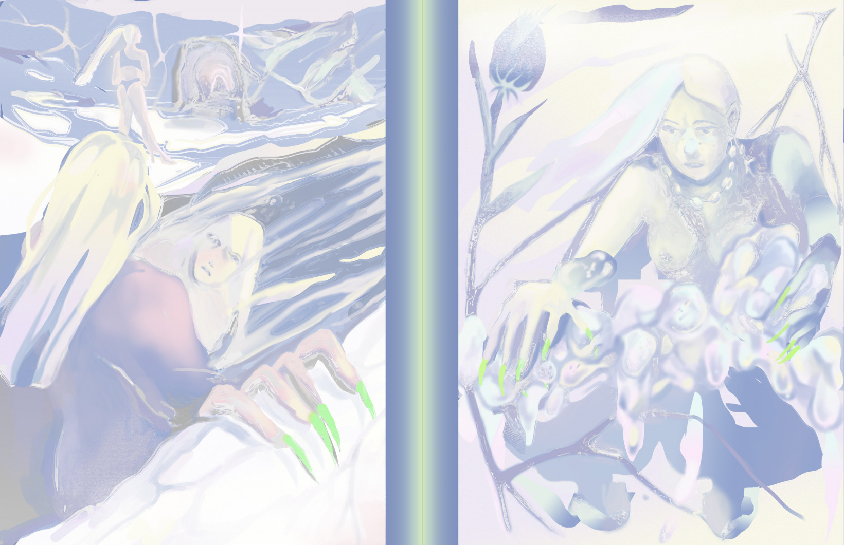 Iva Davidová studuje 2. ročník na FaVU v ateliéru Malířství 3 u Patricie Fexové a Veroniky Vlkové. Je intermediálně založenou vizuální umělec*kyní se zájmem o esteticky přitažlivá místa jedince, které zobrazuje na malbách. Pravidelně publikuje krátké afirmace a digitální koláže na instagramových účtech @abandonyourlines a @unbelievabledawn.